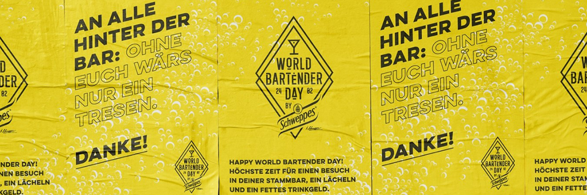 Von Berlin bis Wien, von Frankfurt bis Hamburg: Mit über 3.000 Hängungen in sechs Städten bringt Schweppes seine Botschaft direkt auf die Straßen, um sich bei denjenigen zu bedanken, die die Nächte durchmachen, um unsere zu versüßen. Die urbane Plakatkampagne ist nur der jüngste Beitrag von Schweppes zum World Bartender Day. Bereits in den vergangenen Jahren hat sich die Marke immer wieder mit kreativen Aktionen für die Szene starkgemacht – von Schichtübernahmen durch ihre BAs bis hin zu Feierabendpizzen für Barteams in ganz Deutschland.