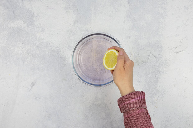 Eine halbe Zitrone ausdrücken und Zitronensaft zusammen mit dem Zucker in die Schüssel geben.