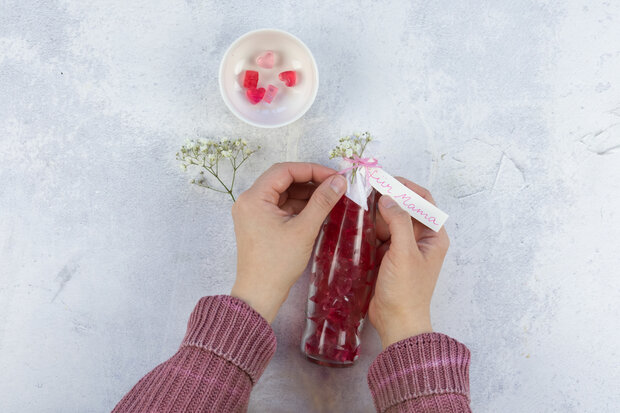 Zum Schluss die Flaschenöffnung mit einem Stück Seidenpapier verschließen und mit Garn zubinden. Wer möchte, kann zusätzlich ein Namensschild an die Flasche binden und sie mit ein wenig Schleierkraut zusätzlich dekorieren.