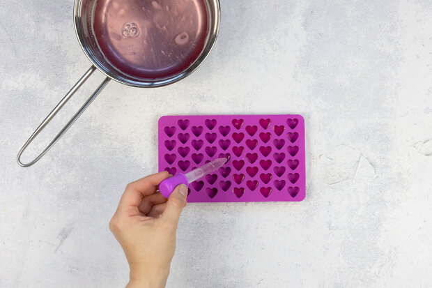 Jetzt die Silikonform aus dem Kühlschrank nehmen, die fertigen Herz-Gummibärchen aus der Silikonform drücken und in die leere Flasche füllen.