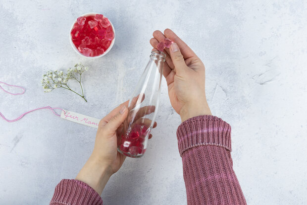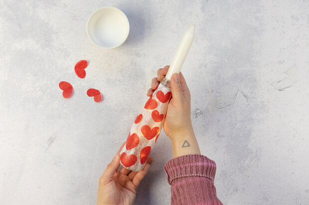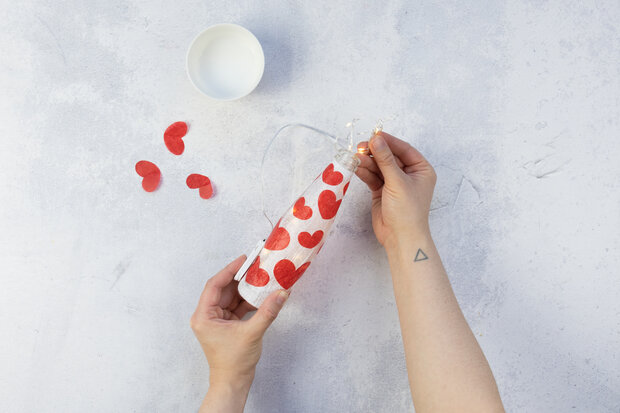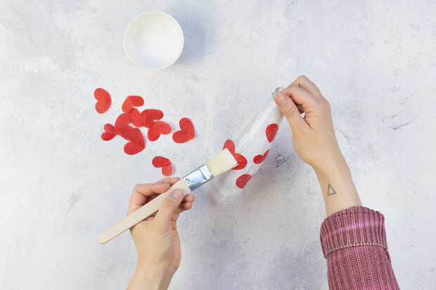 Auf die nun weiße Flasche die roten Herzen positionieren und ebenfalls mit Bastelkleber bestreichen.