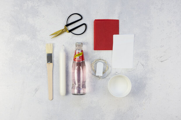 In die Flaschen-Öffnung vorsichtig eine Stabkerze stecken und auf den Tisch stellen.