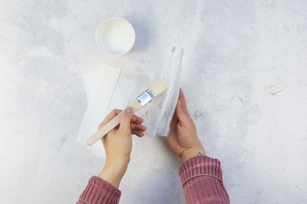 Die weißen Seidenpapier Streifen auf die Flasche legen und mit Bastelkleber einstreichen. So lange wiederholen, bis die komplette Flasche beklebt ist.