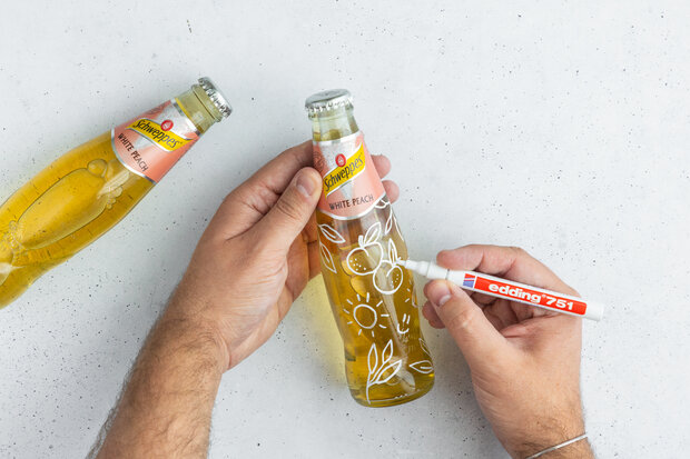 Nun kommt der kreative Teil! Schüttle den weißen Lackmarker gut, damit die Farbe gleichmäßig fließt. Teste ihn am besten zuerst auf einem Blatt Papier. Dann kannst du direkt auf die Flasche malen. Besonders schön wirken florale Muster, kleine Sonnen oder Früchte, passend zum Getränk. Falls du unsicher bist, kannst du dein Design vorher mit einem wasserlöslichen Stift vorzeichnen oder eine Vorlage hinter das Glas halten.