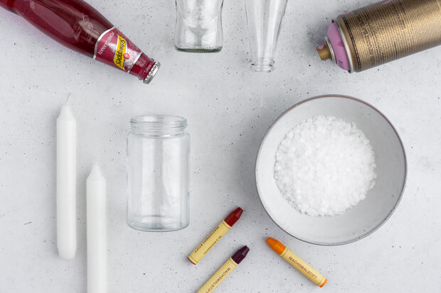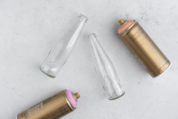 Während die Kerzen trocknen, kannst du dich um die passenden Kerzenhalter kümmern. Dazu reinigst du leere Schweppes Flaschen gründlich von Etiketten und Kleberesten und lässt sie trocknen. Anschließend besprühst du sie in der gewünschten Farbe mit Sprühfarbe. Achte darauf, die Flaschen in mehreren dünnen Schichten zu besprühen, damit die Farbe gleichmäßig aufgetragen wird.