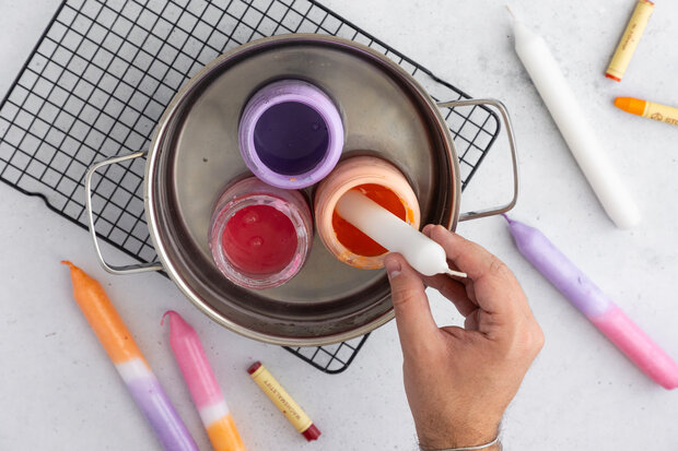 Sobald das Wachs flüssig ist, gibst du je ein Stück Wachsmalstift in jedes Glas, um verschiedene Farben zu erzeugen. Rühre die Farben gut um, bis sie sich vollständig mit dem Wachs vermischt haben. Nun kannst du mit dem Dippen beginnen: Halte eine weiße Kerze am Docht und tauche sie schräg in das gefärbte Wachs. Wiederhole diesen Vorgang mit einer anderen Farbe, um den typischen Dip-Dye-Effekt zu erzielen. Lasse die Kerze zwischen den Farbschichten kurz trocknen, damit die Farben nicht ineinander verlaufen. Die fertigen Kerzen legst du dann zum vollständigen Trocknen auf ein Backgitter oder ein Stück Backpapier.
