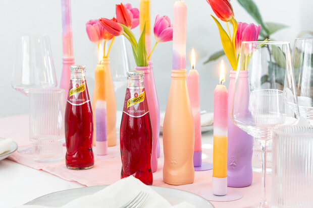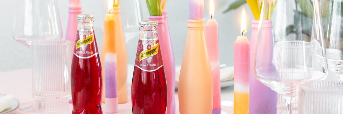 Verwandle einfache Stabkerzen und leere Schweppes Flaschen in einzigartige Deko-Highlights! Mit einem bunten Dip Dye-Effekt und kreativen Upcycling-Flaschen als Kerzenhalter kannst du stilvolle Akzente für dein Zuhause setzen. Ein einfaches, aber effektvolles DIY für ein individuelles Design!