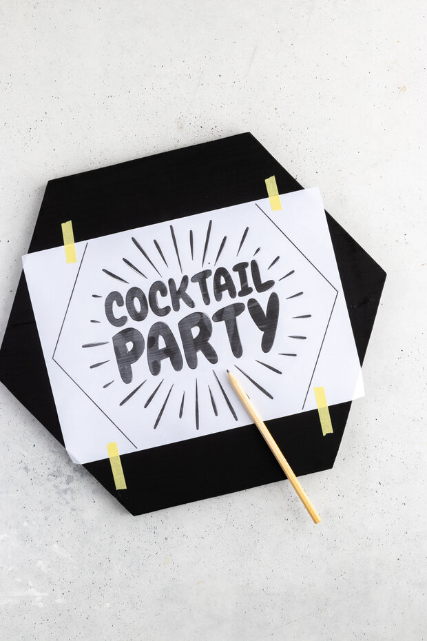 Die Schrift und Dekoelemente anschließend mit einem spitzen Bleistift nachmalen, damit sich die Schrift auf das Tablett überträgt.