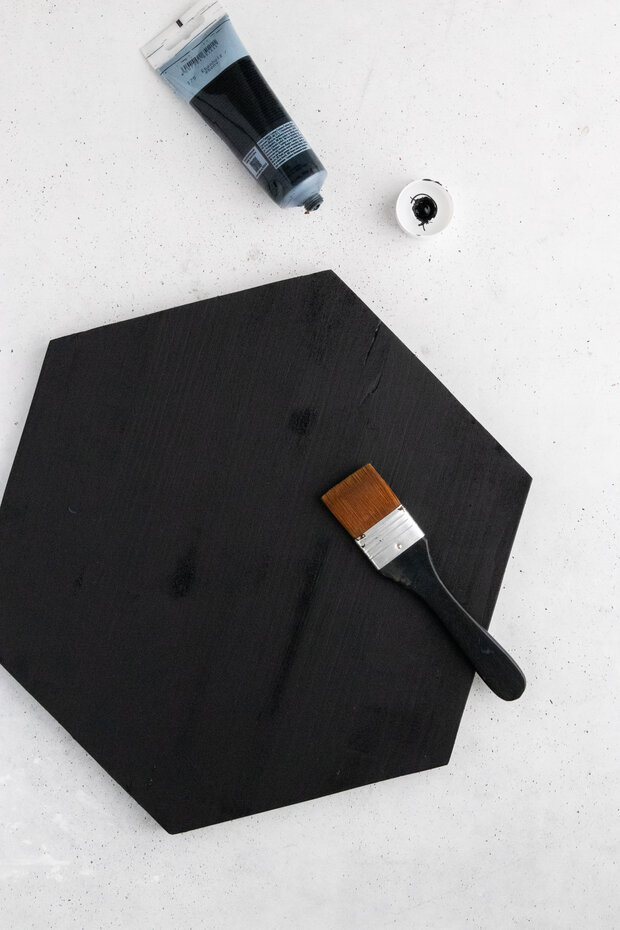 Bearbeitet alle Unebenheiten mit einem Schleifpapier und streicht das Tablett mit schwarzer Acrylfarbe und Pinsel.
