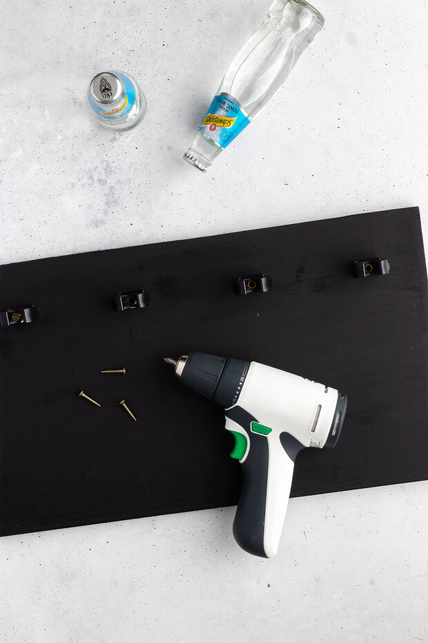 Hier kann nach Lust und Laune das Brett verziert werden. Wir haben uns dafür entschieden es relativ schlicht zu halten und haben in die Zwischenräume der Flaschen das Wort "BAR" mit einem weißen Stift hingeschrieben.