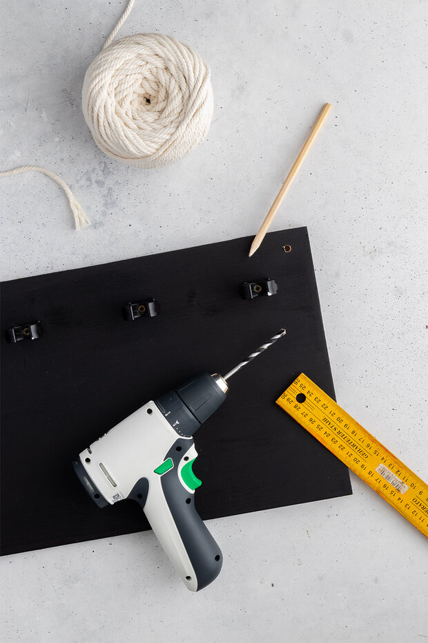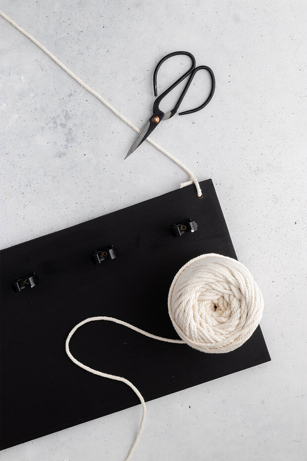 Jetzt nehmt ihr euch das Seil zur Hand und zieht es erst durch das eine Loche, z.B. das linke, und macht es mit einem Knoten fest. Danach schneidet ihr euch das Seil auf die gewünschte Länge zu, sodass ihr das zweite Ende an der anderen Seiten ebenfalls durchziehen und mit einem Knoten festmachen könnt.