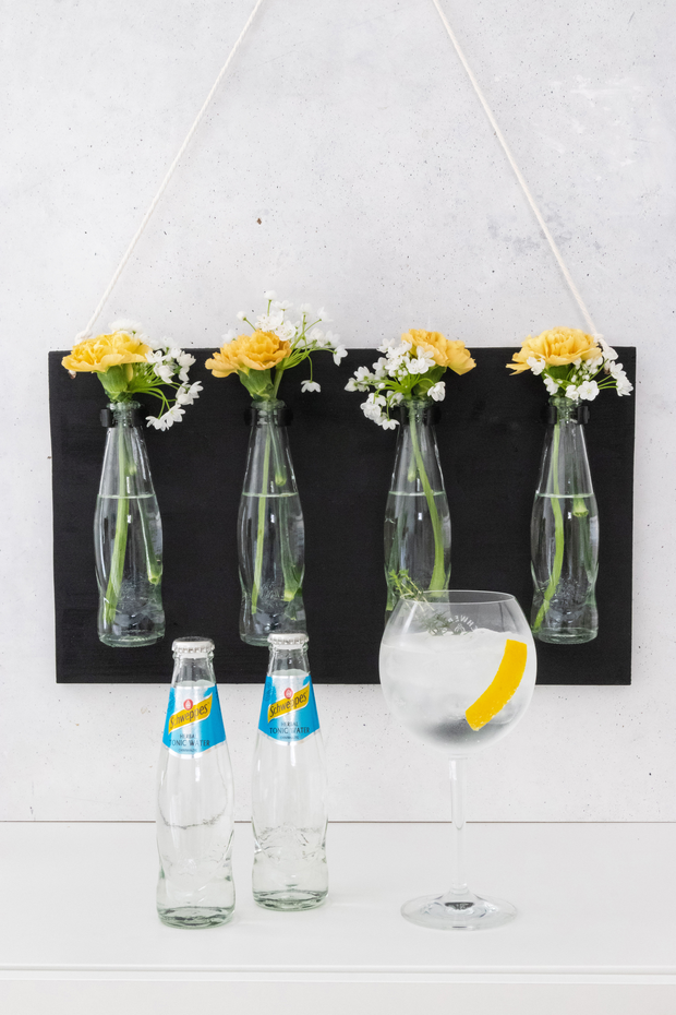 Du kannst deine Schweppes Flaschen auch als Wandvase upcyclen! Einfach etwas Wasser in die Flaschen füllen und mit deinen Lieblingsblumen dekorieren.