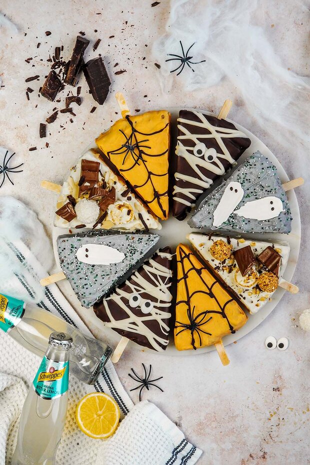 Für alle anderen sechs Stücke insgesamt 750g weiße Kuvertüre klein hacken und mit Kokosöl schmelzen. Nach Belieben Lebensmittelfarbe untermischen und die Stücke im Halloweenstil dekorieren.