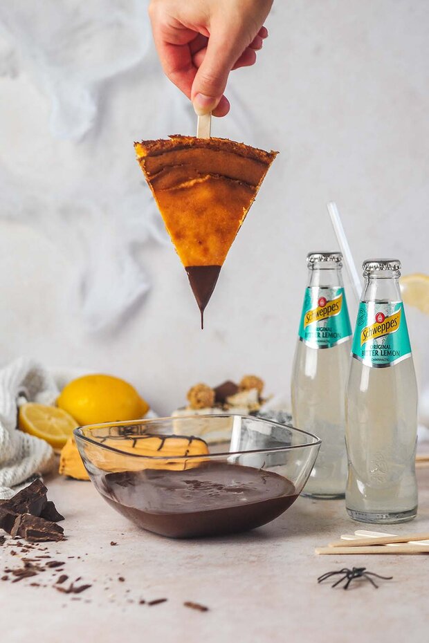 Den vollständig abgekühlten Käsekuchen vom Rand lösen und aus der Form nehmen. Den Kuchen in 8 gleichgroße Stücke schneiden. Je einen Holzspieß in jedes Stück schieben und mindestens 30 Minuten ins Gefrierfach legen, bevor die Stücke mit Schokolade überzogen werden.