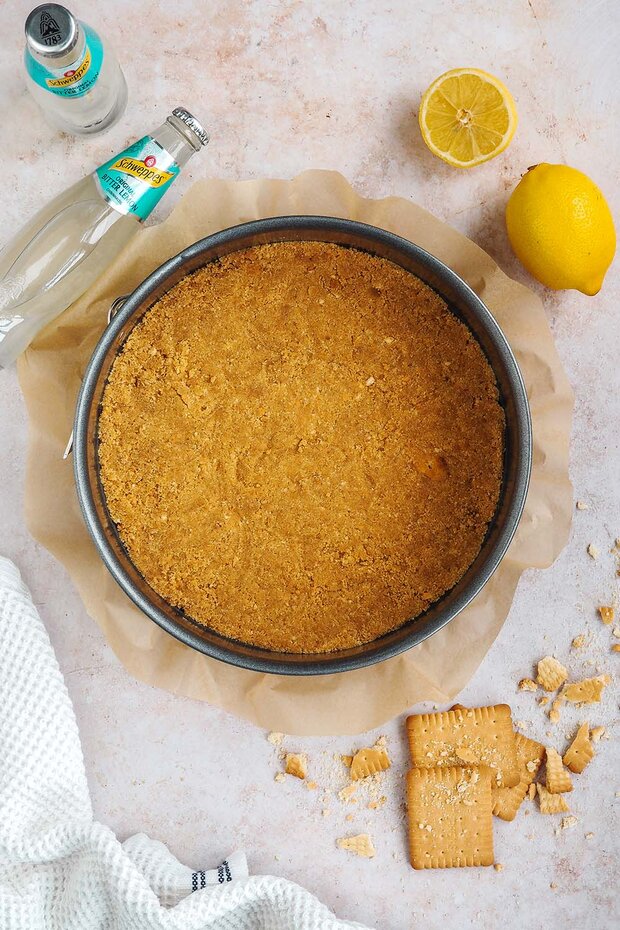 Ein Backpapier in eine Springform spannen und den Backofen auf 180 Grad O/U vorheizen. Währenddessen die Butterkekse mit einem Mixer fein zerkleinern und die Butter schmelzen.