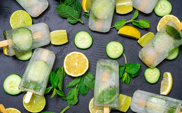 3. Die Eisformen vor dem Befüllen mit kaltem Wasser ausspülen. Pro Form 2 Gurkenscheiben hineinlegen. Nach Belieben mit kleinen Minz- und Basilikumblättern ergänzen. Das Schweppes Tonic Water Zero und die Gin-Mischung miteinander vermengen und die Eisformen damit befüllen.