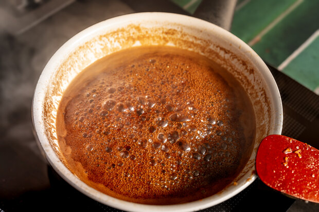Den Ofen auf 220 °C vorheizen und ein Backblech mit Backpapier auslegen. Eine mittelgroße Pfanne bei mittlerer bis hoher Hitze erhitzen. Die Butter, den gehackten Knoblauch, den Honig, die Sojasoße und Schweppes White Peach in die Pfanne geben. Alles zusammen glatt rühren und die Soße für etwa 3-4 Minuten köcheln lassen, bis sie