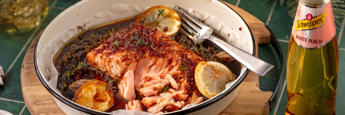 Entdecke unser Rezept für Lachsfilet mit Schweppes White Peach, ein einfaches, aber geschmackvolles Gericht, das in nur 30 Minuten zubereitet ist. Die Kombination aus fruchtiger Glasur, Knoblauch und Thymian bringt frischen Wind auf den Teller und macht das Lachsfilet zum Highlight jeder Mahlzeit. Ideal serviert mit Reis und Broccoli, ist dieses Rezept perfekt für einen schnellen Abend oder ein entspanntes Dinner. Lass es dir schmecken!