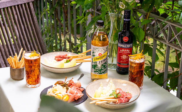 Anschließend alles auf dem Tisch servieren und den passenden Drink zubereiten: Ramazzotti Ginger mit Schweppes Ginger Ale Zero.