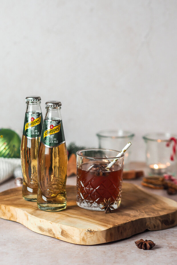 Alle Zutaten auf Eis in einem Tumbler Vermischen, mit Sternanis garnieren