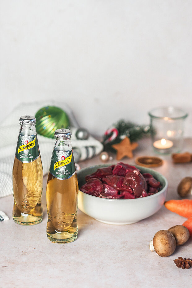 Mit Rotwein ablöschen, dann den Wildfond und Schweppes Ginger Ale dazugeben. Ebenso die Lorbeerblätter, Piment, Senf, Essig und Rosmarin dazugeben. Den Herd auf untere Stufe herunterschalten, das Fleisch wieder dazugeben und mit dem Deckel drauf für ca. 2-2,5 h köcheln lassen. Gelegentlich umrühren.