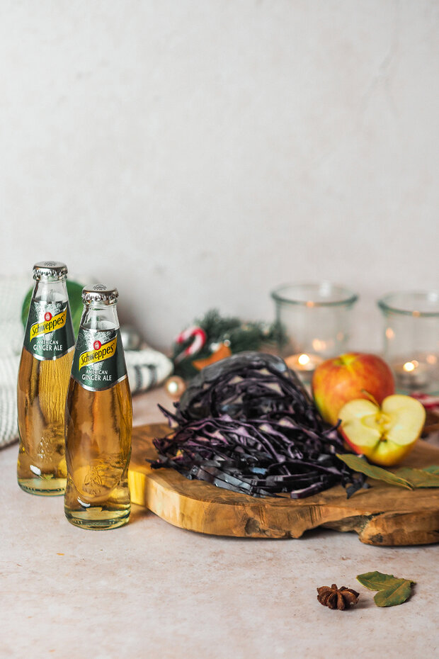 Währenddessen den Rotkohl längs halbieren, jeweils den Strunk rausschneiden und dann in ganz dünne Streifen schneiden. Die Zwiebel und den Apfel schälen und in kleine Würfelchen schneiden. Butterschmalz in einem großen Topf erhitzen, die Zwiebel und den Apfel darin anbraten, dann den Rotkohl dazugeben. Auf geringe Hitze herunterschalten, mit dem Apfelsaft ablöschen und soviel Wasser dazugeben, dass der Kohl gerade so bedeckt ist. die Lorbeerblätter unterrühren. Den Deckel drauf geben und mind. 1-1,5h köcheln lassen, dabei immer mal wieder umrühren.