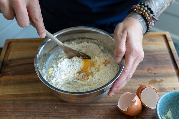 Die abgekühlten, zerstampften Kartoffeln mit Eiern, Milch, Mehl, Backpulver und weicher Butter in eine Schüssel geben und zu einem glatten Teig verrühren. Mit Salz, Pfeffer und Muskat würzen. Der Teig sollte dickflüssig, aber streichfähig sein.