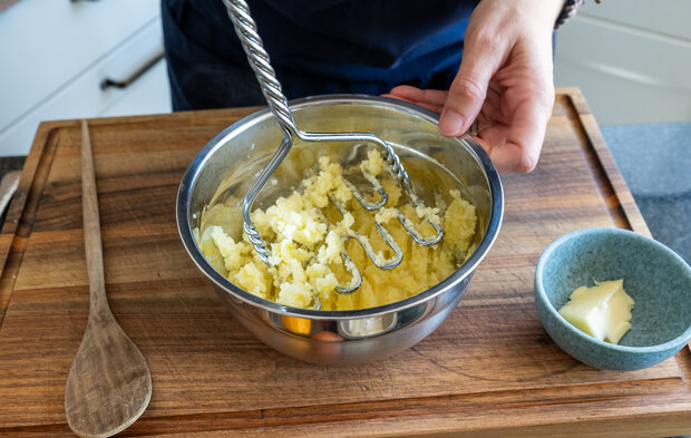 Die Kartoffeln schälen und in Salzwasser weich kochen. Anschließend abgießen, kurz ausdampfen lassen und fein zerstampfen.