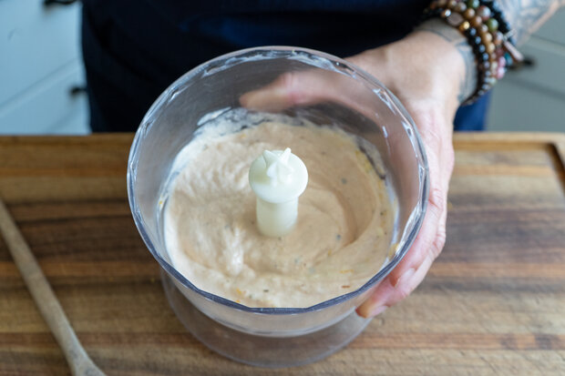 Für die Lachscreme Frischkäse mit Schweppes Virgin Orange Spritz, Orangenabrieb, Dijon-Senf, Salz und Pfeffer in einen Mixer geben. Den gezupften Räucherlachs hinzufügen und alles fein pürieren. Die Creme bis zum Servieren kühl stellen.