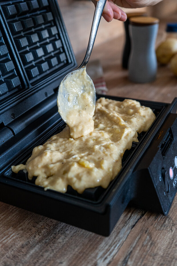 Das Waffeleisen vorheizen und leicht einfetten. Den Teig portionsweise hineingeben und die Kartoffelwaffeln goldbraun ausbacken.