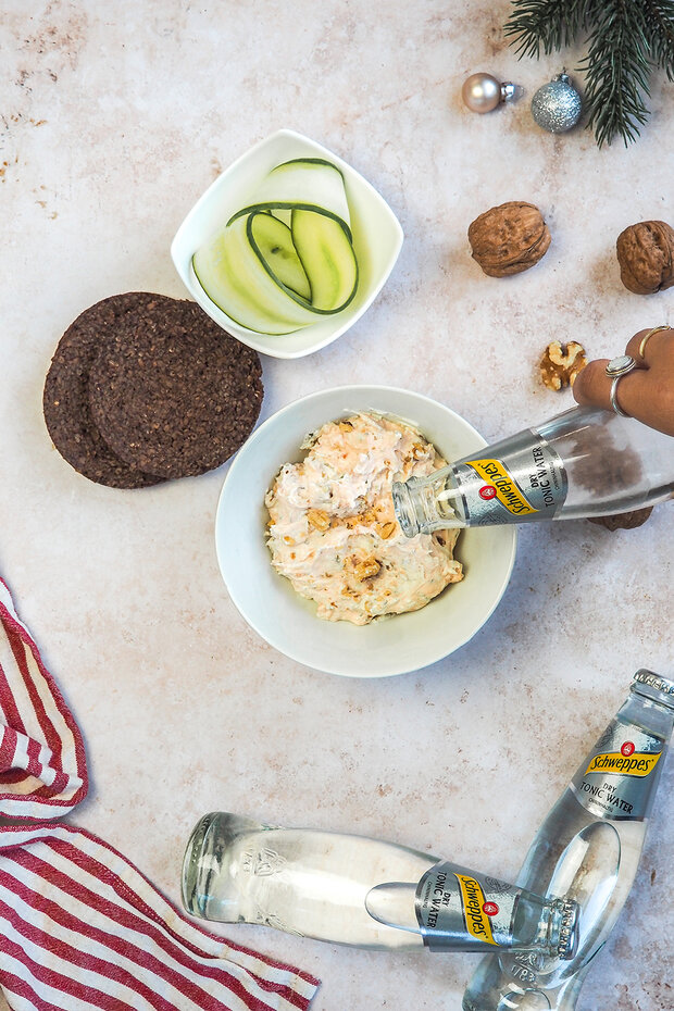 Die 5 EL Schweppes Dry Tonic Water mit dazugeben und mit Salz & Pfeffer würzen. Bis zur weiteren Verwendung in den Kühlschrank stellen.