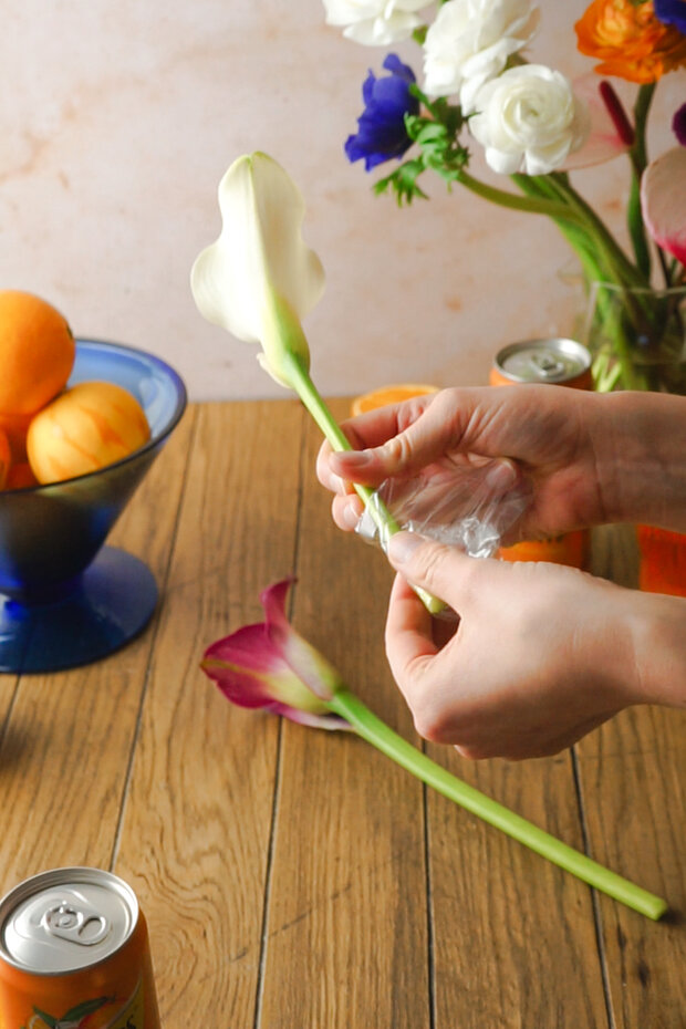 Die Stiele der Blumen zunächst mit Frischhaltefolie, dann mit Floristenband umwickeln, sodass sie keinen direkten Kontakt mit der Torte haben.