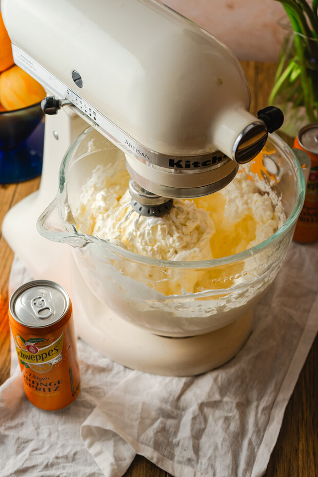 Die Butter stückchenweise bei mittlerer Geschwindigkeit einrühren.