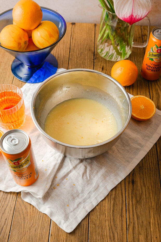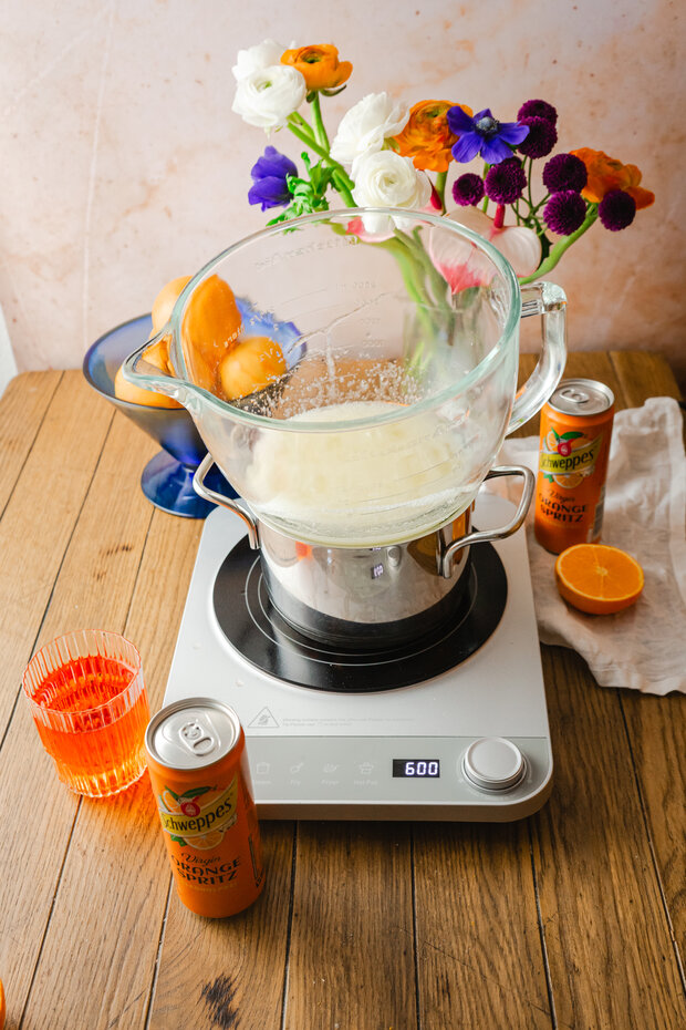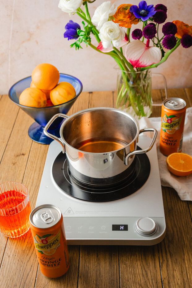 Schweppes Virgin Orange Spritz zusammen mit dem Zucker in einen Topf geben und kurz erhitzen, bis sich der Zucker vollständig gelöst hat.