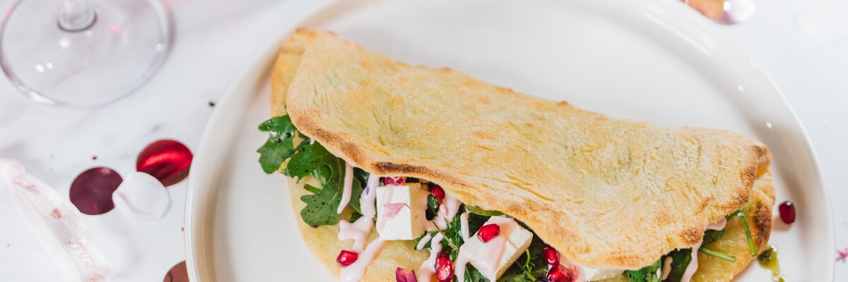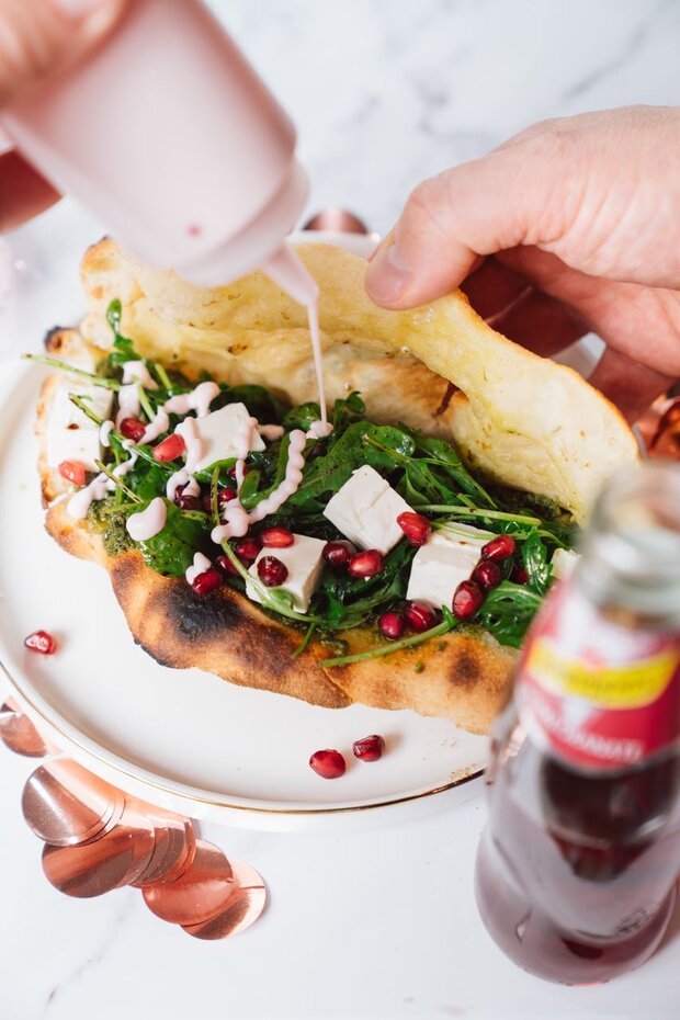 Das Pizzastandwich aus dem Ofen nehmen, aufklappen, mit Pesto den untern Teil bestreichen. Mit Ruccola, Fetawürfel und Granatapfelkerne füllen und mit der Granatapfelmayonnaise garnieren.
