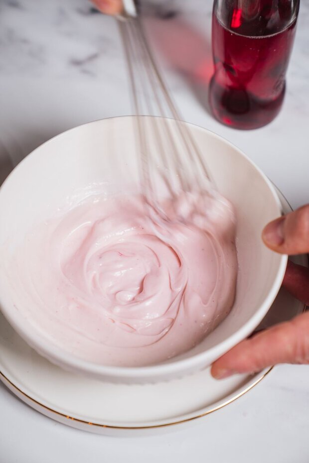 Für die Granatapfelmayonnaise werden 2 EL Mayonnaise und 2 EL Schweppes Pomegranate miteinander vermengt.