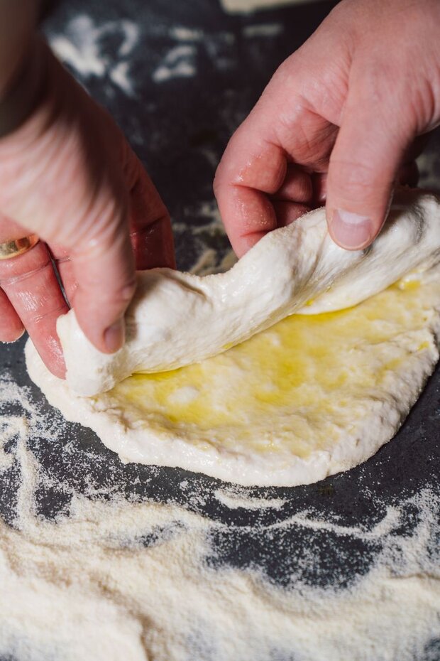 Den Teig in 4 Stücke teilen und rundherum von außen nach innen falten. Dann erneut 30 Minuten in einem verschlossenen und geölten Behälter gehen lassen.