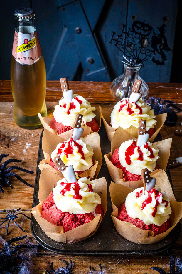 Diese schaurig, leckeren Red Velvet Cupcakes mit Schweppes White Peach beigeistern alle kleinen und großen Gäste auf deiner nächsten Halloweenparty. Sie schmecken nicht nur unheimlich gut, sondern sorgen auch noch für die passende Atmosphäre.