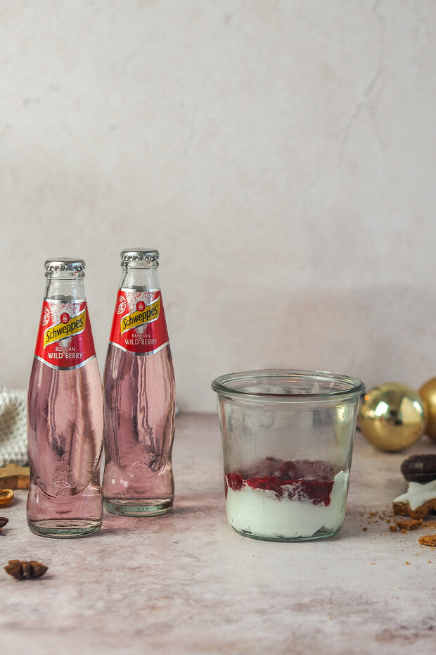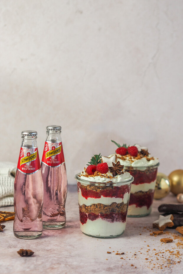 Zu guter Letzt auf jedes Dessert 2-3 frische Früchte zur Deko setzen und etwas Brösel darüber streuen. Wer möchte kann auch noch ein Rosmarinzweig und einen Zimtstern darauf setzen.