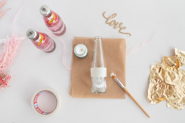 Zu Beginn die Etiketten auf den Flaschen entfernen und diese gründlich reinigen - das Glas sollte fettfrei und trocken sein. Als nächstes klebst du mit Hilfe des Malerkrepp das untere Drittel der Glasflasche ab. Bestreiche nun mit einem Pinsel das untere Drittel der Flasche dünn mit Anlegemilch und lasse diese solange trocknen bis sie durchsichtig wird.