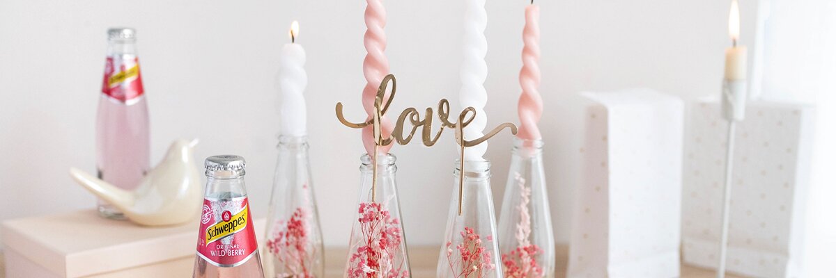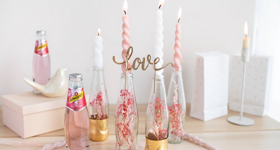 Zum Schluss setzt du noch die passenden Stabkerzen auf die Glasflaschen. Wichtig ist, dass diese fest im Flaschenhals befestigt sind, um ein Kippen zu vermeiden. Dekorieren kannst du die Flaschen noch passend zum Thema mit schönen Bändern aus Samt, Spitze oder Satin.