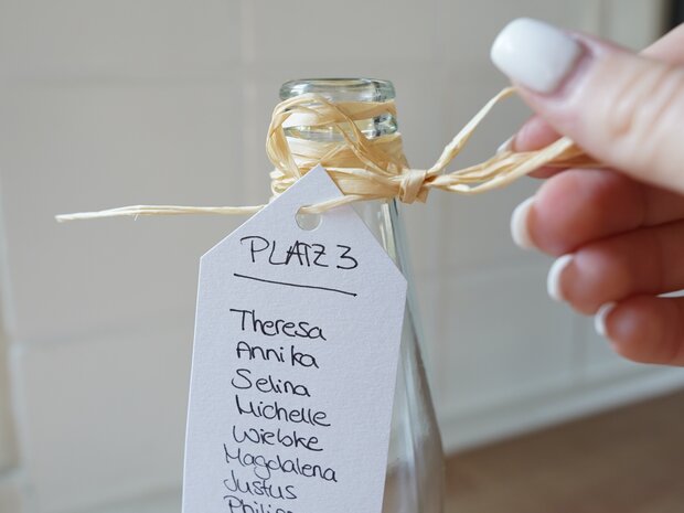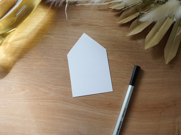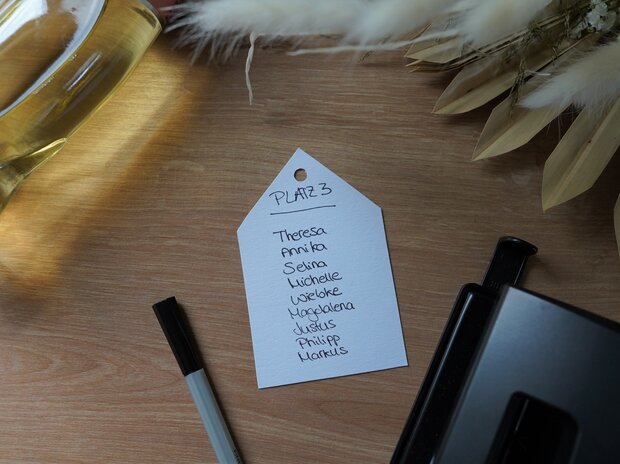 Beschrifte das Häuschen, indem du Platznummer und die Namen der Gäste darauf schreibst. Nun kannst du mit dem Locher oben mittig ein Loch stechen, wo du das Band durchfädeln kannst.