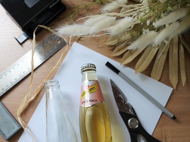 Fädele das Band durch und wickle es gleichzeitig um die leere Schweppes Flasche. Verschließe das Ende mit einem Knoten und einer anschließenden Schleife.