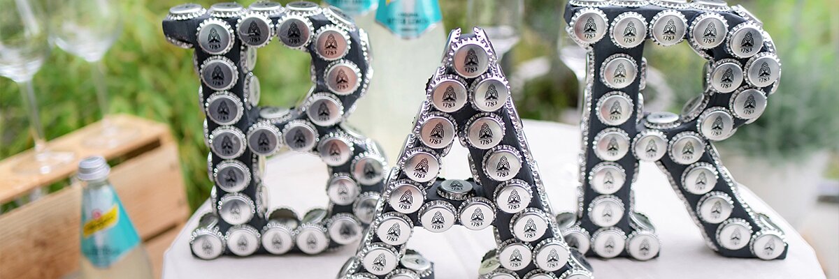 Die Buchstaben aus Pappkarton werden anschließend mit Acrylfarbe bemalt und Kronkorken beklebt. So entsteht mit wenig Material ein tolles Deko-Highlight für Eure Hochzeit.