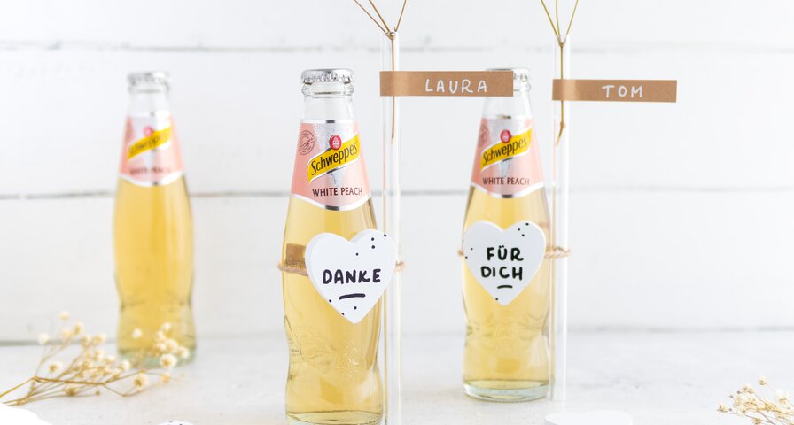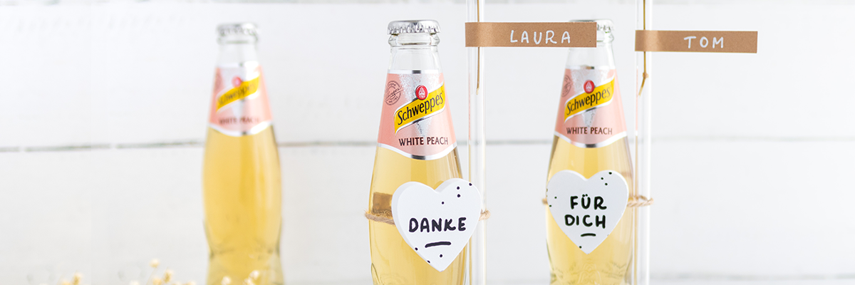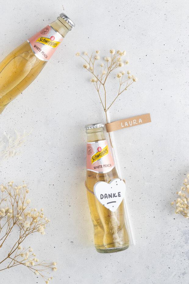 Schweppes Flaschen mit Herzschild und Glasstrohhalm