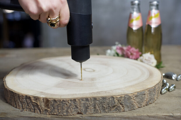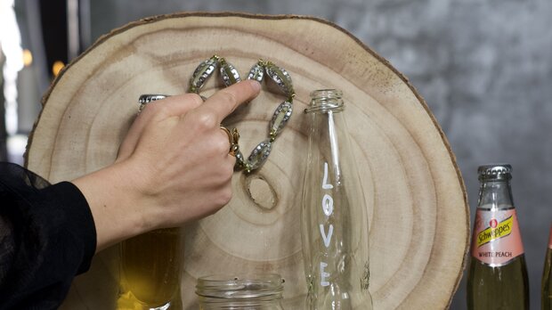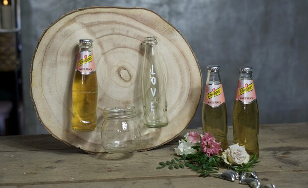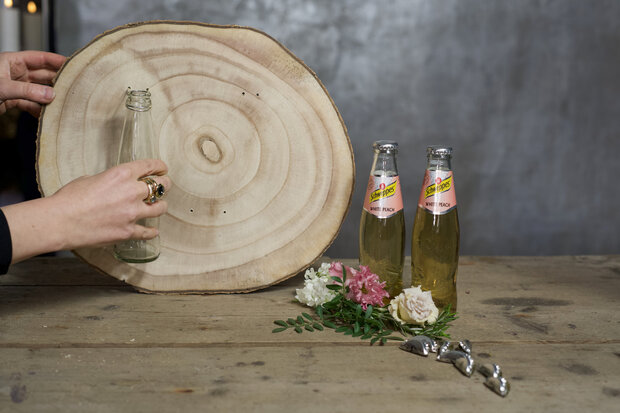Nach Belieben können Schweppes-Flaschen und Einmachgläser an der Holzscheibe befestigt werden.