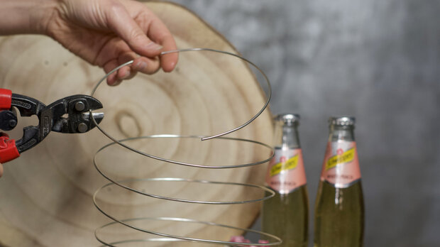 Die leeren Schweppes-Flaschen werden anschließend mit dem Draht umwickelt und dann durch die Löcher an der Holzscheibe befestigt. Der Draht wird auf der Rückseite verdreht, um die Flasche zu fixieren.