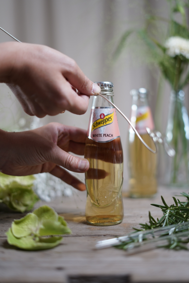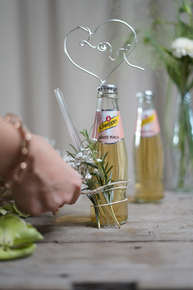 Stülpe über den Flaschenboden zwei Gummis. Befestige daran die Strohhalme und das grüne Dekomaterial. Achte darauf, dass alles gut fixiert ist.