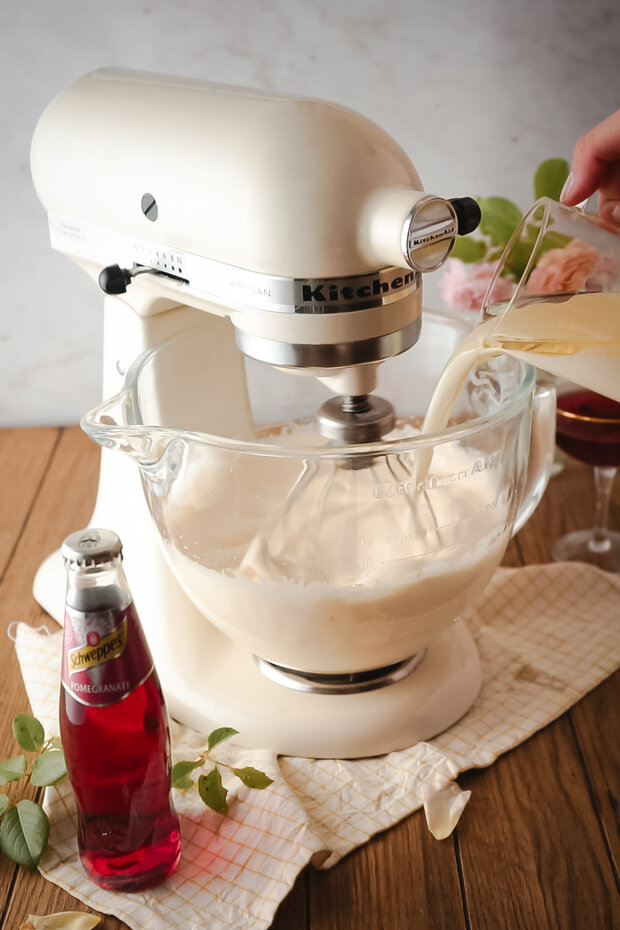 Die Eiweißmasse in eine Küchenmaschine geben und auf höchster Stufe für ca. 10 Minuten aufschlagen, bis sie feste Spitzen bildet und Raumtemperatur erreicht hat.