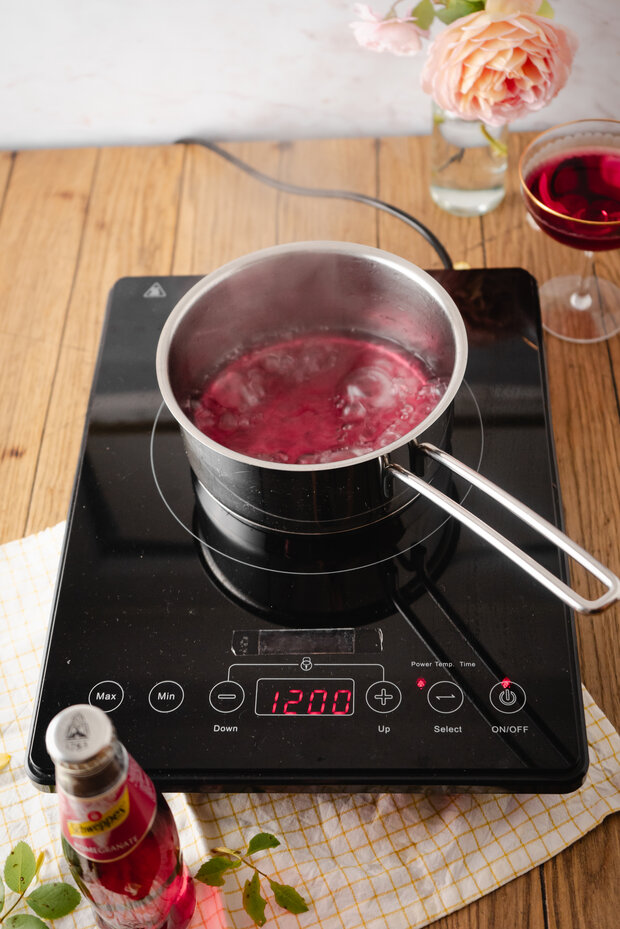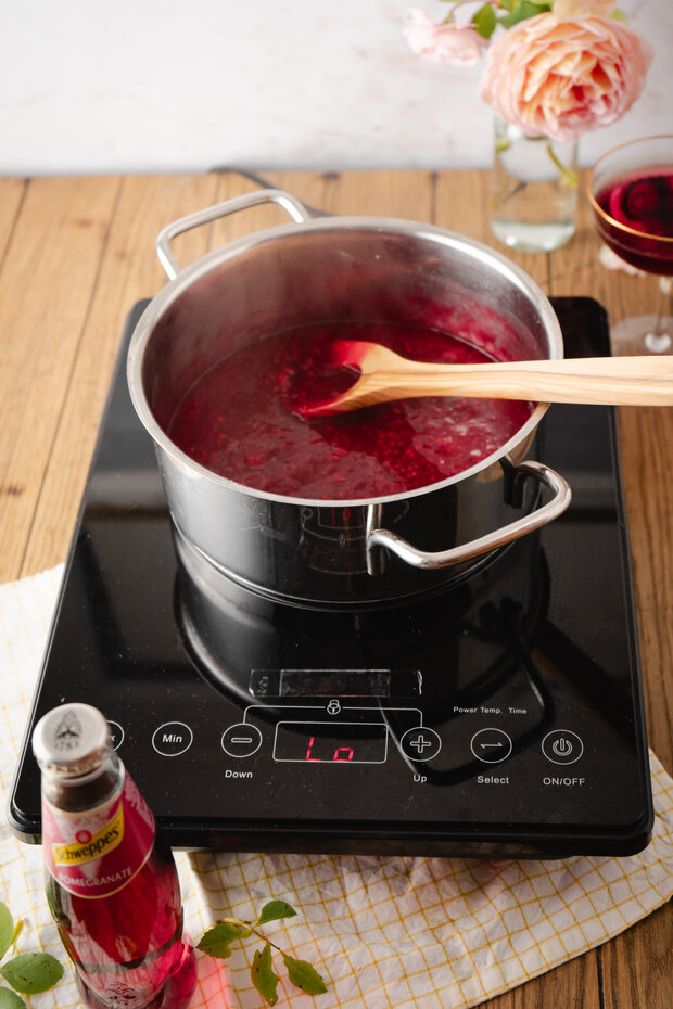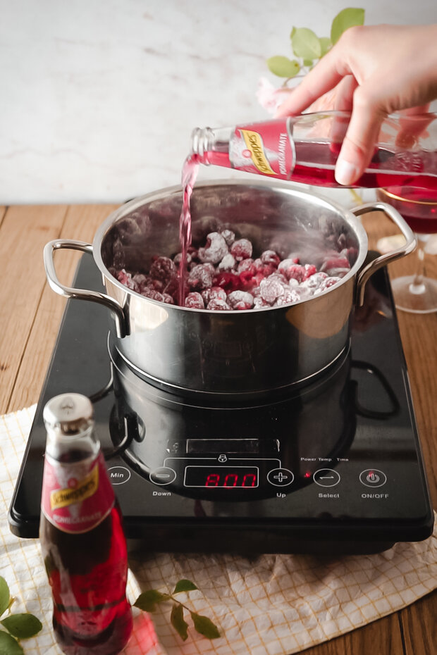 Alle Zutaten samt Schweppes Pomegranate in einen Topf geben und erhitzen bis die Beeren aufgetaut sind. Nun unter Rühren köcheln lassen, bis die Masse eindickt und die Flüssigkeit etwas verdampft ist.
